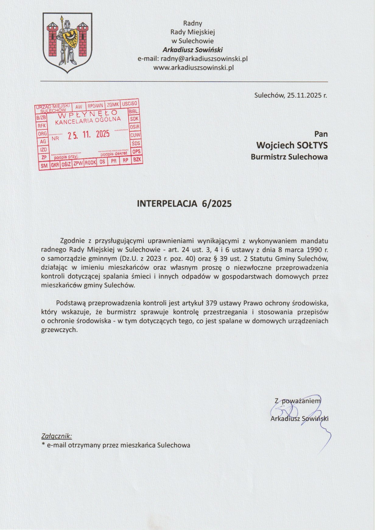 W związku z trwającym sezonem grzewczym i występujących zanieczyszczeniach powietrza co jest dużym zagrożeniem dla zdrowia mieszkańców gminy Sulechów, w dniu dzisiejszym złożyłem interpelację zaadresowaną do Burmistrza Sulechowa Wojciech Sołtysa.