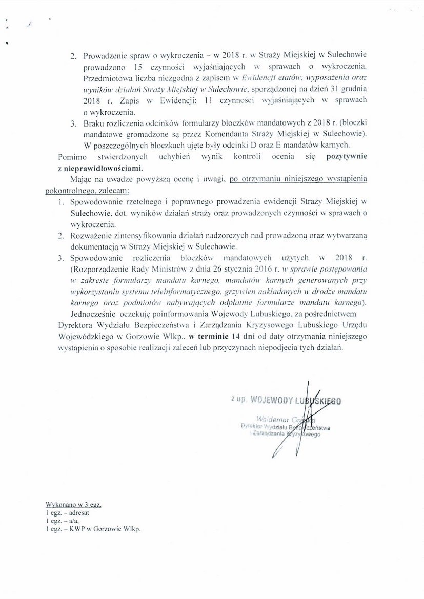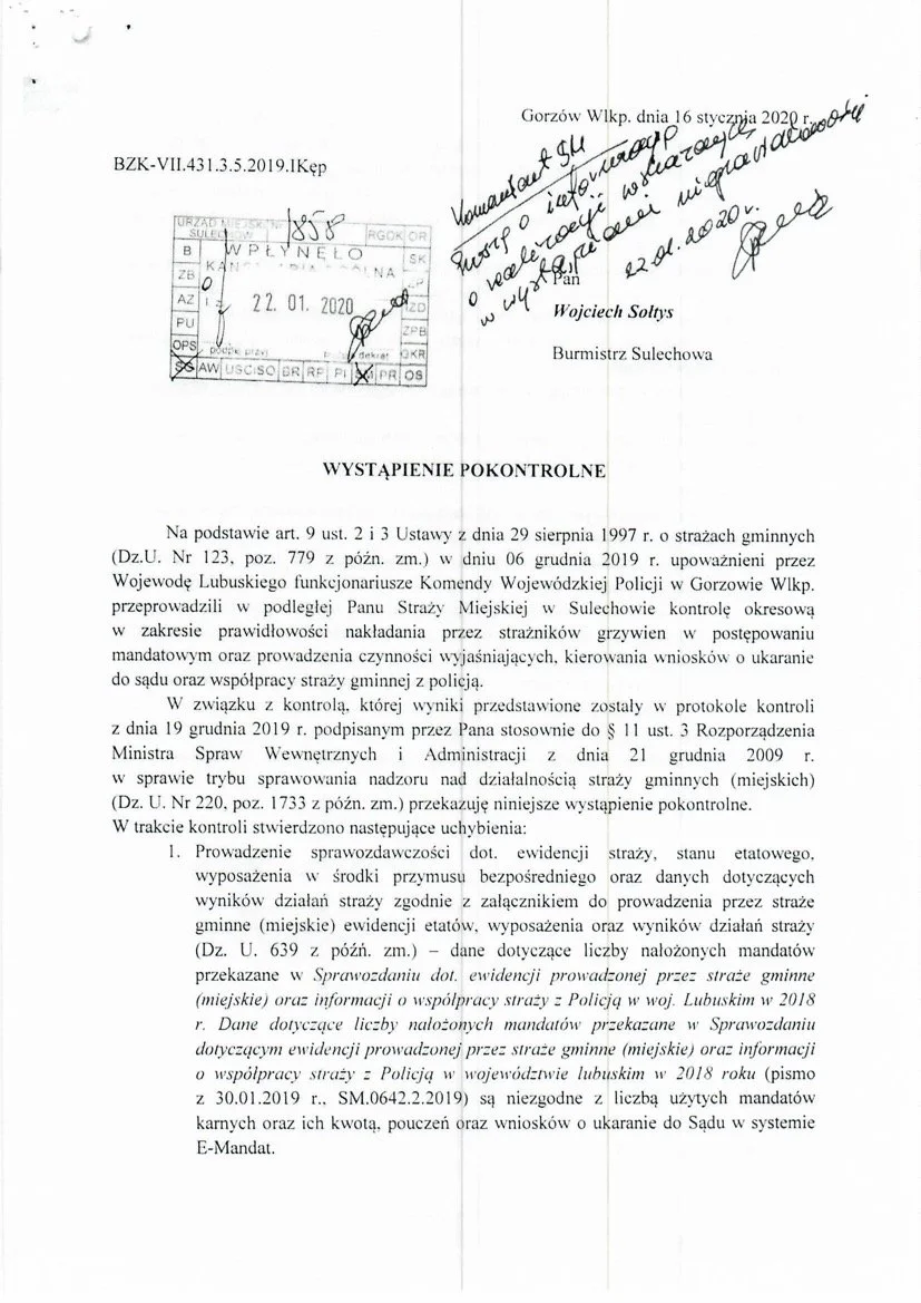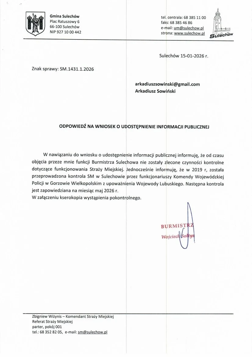 Po przeprowadzonej analizie notatników służbowych przez strażników miejskich z miesiąca września 2025 roku w dniu dzisiejszym (30.12.2025 r.) złożyłem wniosek o udostępnienie informacji publicznej dotyczącej nadzoru nad działalnością Straży Miejskiej w Sulechowie.