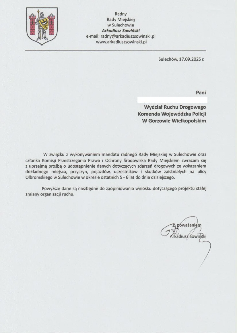 W dniu dzisiejszym (17 września 2025 roku) wysłałem do Wydziału Ruchu Drogowego Komendy Wojewódzkiej w Gorzowie Wielkopolskim pismo z prośbą o udostępnienie danych dotyczących zdarzeń drogowych na ulicy Olbromskiego w Sulechowie.